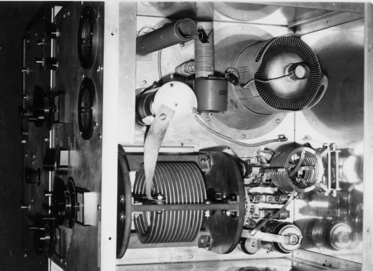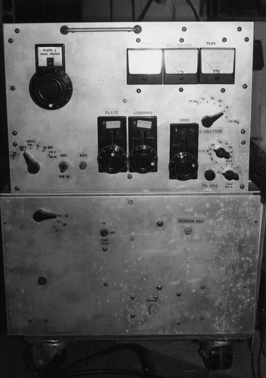 Chassis -- Starting at upper left. Y-330B tube socket. RF input relay (RJ1A) and 0mA bias supply. 50-ohm reflectometer for adjusting grid roller coil (small aluminum box with BNC fittings. Coil ends of two RJ-1A output relays (one hidden). Filament transformer. // Next row from left. Bifilar 1:4, 50/200 ohm input matching transformer. Grid DC blocking capacitor and grid terminal. [blue] filter capacitor for bias supply. HV meter multiplier resistor. // Next row: Ferrite core padder inductors to allow grid roller-coil to cover lower frequencies. . Grid roller coil (5.5uH). Load vacuum cap. right angle drive. Tune cap right angle drive. // Next row: Grid termination R. (probably should have been located closer to the grid terminal.) // Last row. Filament rheostat. Plugs for nterconnecting cables. Multimeter switch.