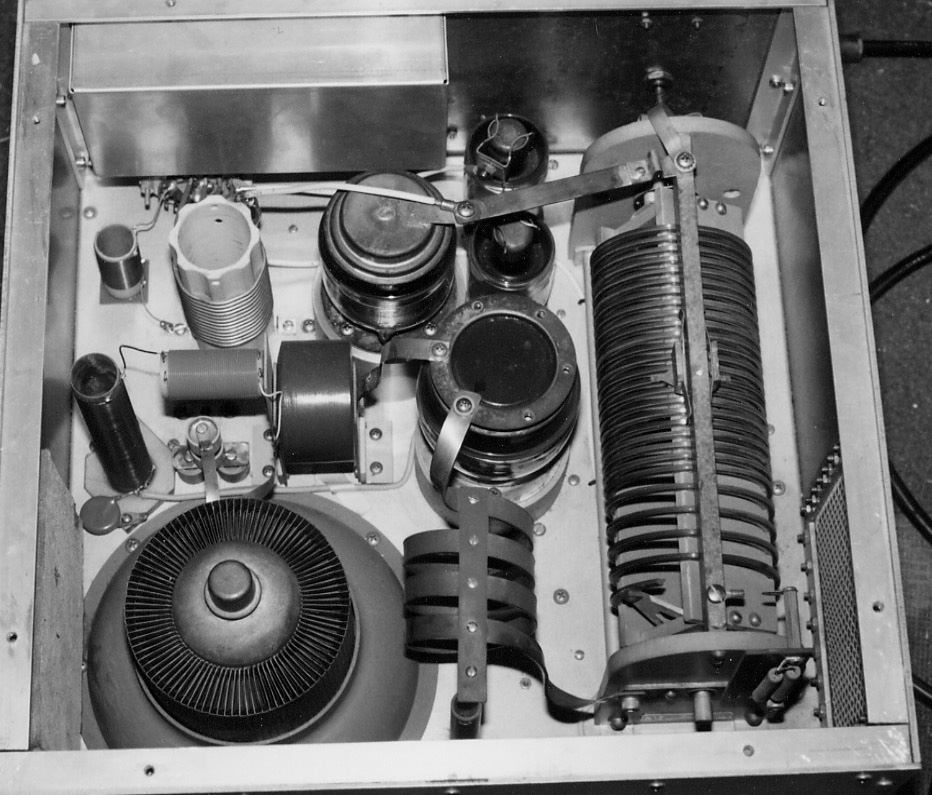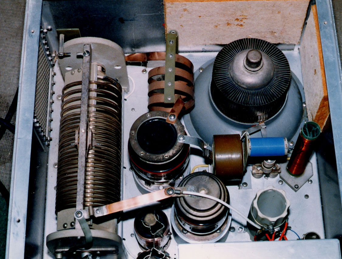 8169: Top: Starting at upper left: 50uH choke from Load-C to gnd. L section of tank. Load-C, 2000pF, 5000v. Two, fixed 750pF vacuum C for Load C padder. // Next row: Low bands HV-RFC. High-bands HV-RFC. Neutralizing bridge, capacitive voltage-divider. DC blocking C. Tune-C, 500pF, 15kV. 22uH variable inductor (tank). // Last row. Tube. 10m tank coil. Spark gap w. series R. . .